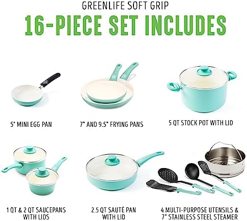 Introducing GreenLife Soft Grip Healthy Ceramic Nonstick 16 Piece Kitchen Cookware Set